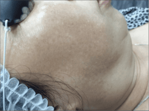 トーニングやGDトーニングで起こりやすい失敗のひとつが、色素のトラブルです。施術後に肌の一部が白く抜ける「色素脱失」や、逆に茶色く残る「色素沈着」が見られる場合があります。特にトーニングは低出力を繰り返し照射する施術ですが、未熟な施術者によって、同じ部位に何度もレーザーが照射され、メラノサイトに蓄積的なダメージが加わると、斑状の白斑のような“まだら模様”が生じることがあります。
